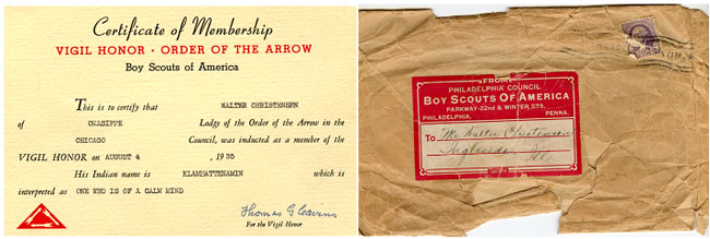 I expound about how researching sashes is a bit like doing detective work. A clue here a shed of evidence there and the researcher draws a conclusion rightly or wrongly from what he sees. I received this 1935 certificate with a Type 2 No Arrow sash in this mailer envelope from Philadelphia, intact from the original recipient. It establishes the date of after August 1935 for Type 2 No Arrow sashes. The mailer envelope from Philadelphia eliminates opinions that the Type 2 No Arrow sash was somehow an Owasippe or Midwestern issue sash. However, because it is known that some east coast Vigils were receiving sashes with arrows in 1935 (and before), it raises the question why were different sashes being presented at roughly the same time? |